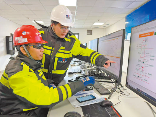 在乌兹别克斯坦塔什干光储项目储能站主控制室内,中方工程师正指导外籍员工检查线路侧运行数据