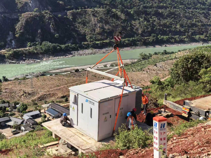 近日,电控工程公司华能保山鱼和 220MW 山地光伏项目首台箱式变压器吊装就位。